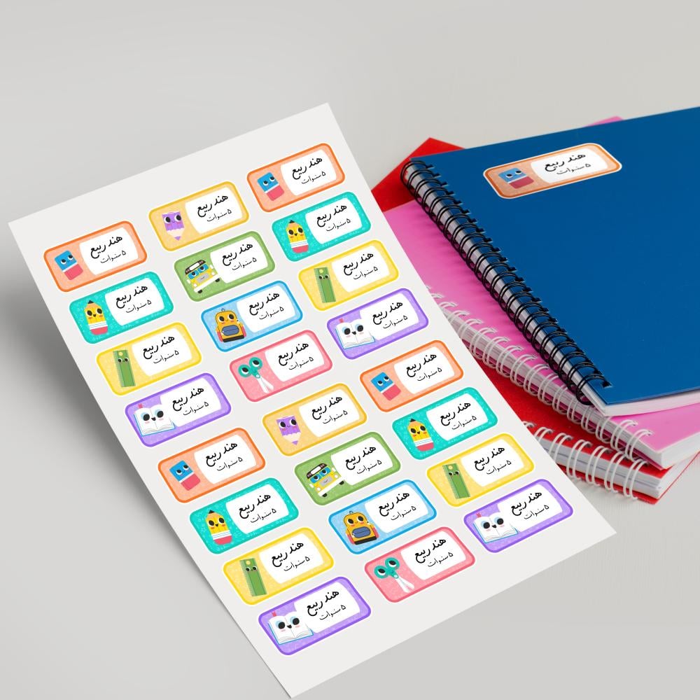 خلي تنظيم أدوات المدرسة ممتع وسهل مع ملصقات اسماء للكتب ملونة من نجد برنت بألوان جذابة ورسومات كرتونية مرحة ، تساعد الطلاب على كتابة أسمائهم على الدفاتر، الكتب، والملفات بشكل منظم وأنيق.